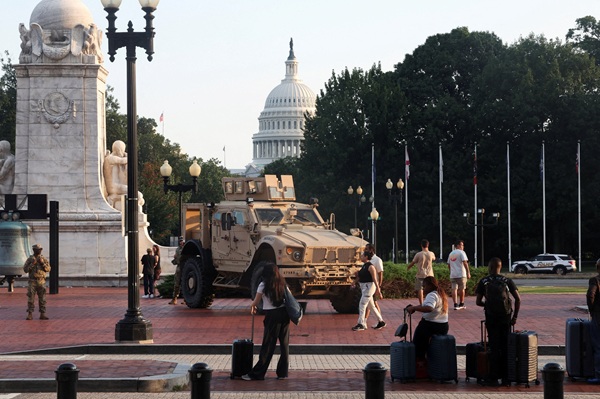People walk past members of the National Guard patrolling Union Station, after U.S. President Donald Trump deployed the National Guard and ordered an increased presence of federal law enforcement to assist in crime prevention, with the U.S. Capitol building in the background, in Washington, D.C., U.S., August 16, 2025. REUTERS/Alex Kent REFILE - CORRECTING INFORMATION FROM "AFTER U.S. PRESIDENT DONALD TRUMP FEDERALIZED THE METROPOLITAN POLICE DEPARTMENT UNDER THE HOME RULE ACT" TO "AFTER U.S. PRESIDENT DONALD TRUMP ORDERED AN INCREASED PRESENCE OF FEDERAL LAW ENFORCEMENT".