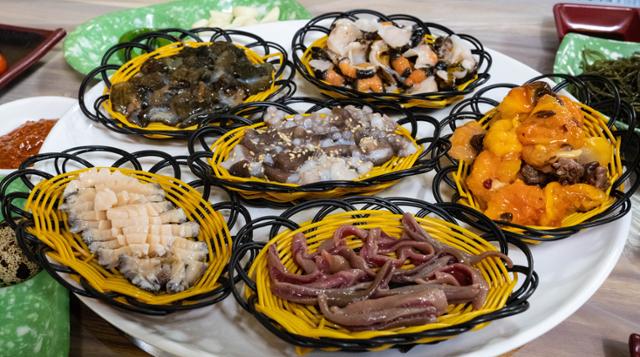 해녀들이 잡은 해산물로 차리는 해물모둠상은 바닷속에 있는 것처럼 생생하다. 전복, 소라, 낙지, 멍게, 개불, 해삼 등 대여섯 가지 해산물을 손질해서 각각 담아낸다. 해물모둠의 구성과 양은 철에 따라 조금씩 바뀐다. 데친 꼬막과 고둥, 해초 등 밑반찬이 곁들임으로 나온다. 특히 수북이 담긴 해삼에서 바닷가의 인심을 엿볼 수 있었다. 풍성한 한 상을 다 비우고 나면 배가 차기 마련이지만 아직 멈출 수 없다. 해녀촌의 자랑인 전복죽이 남았기 때문이다.
