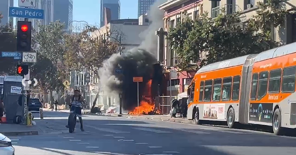 8월 27일 오후 5시경, 로스앤젤레스 다운타운 305 E 5th St(산 페드로와 5가 인근)에서 대형 야외 화재가 발생해 소방대와 경찰이 긴급 출동했습니다.