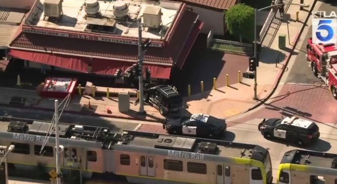 이스트 LA서 차량, 전철과 충돌 뒤 킹 타코 매장 돌진
