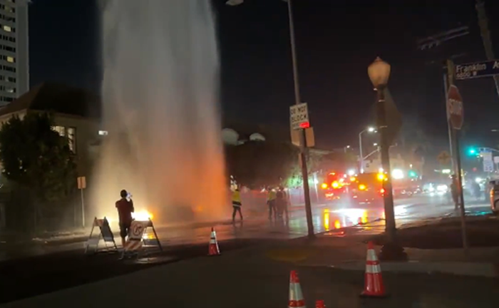 로스앤젤레스 프랭클린 애비뉴(Franklin Ave)와 힐크레스트 로드(Hillcrest Rd) 교차로에서 차량이 소화전을 들이받는 사고가 발생해 대형 물기둥이 밤 하늘로 쏟아졌습니다.
