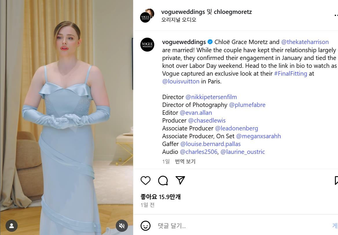 AP통신과 미 패션지 보그 등에 따르면 모레츠는 2018년부터 교제해온 모델 겸 사진작가 해리슨과 지난 노동절(9월1일) 연휴 기간 비공개 결혼식을 올렸다.