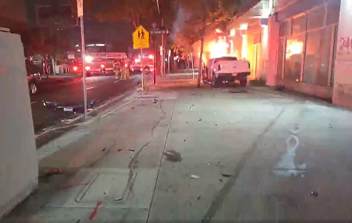 지금 들어온 로스앤젤레스 베니스블러바드와 사우스 그랜드 애비뉴에서 발생한 대형 차량 사고와 화재 현장의 긴급 속보입니다.