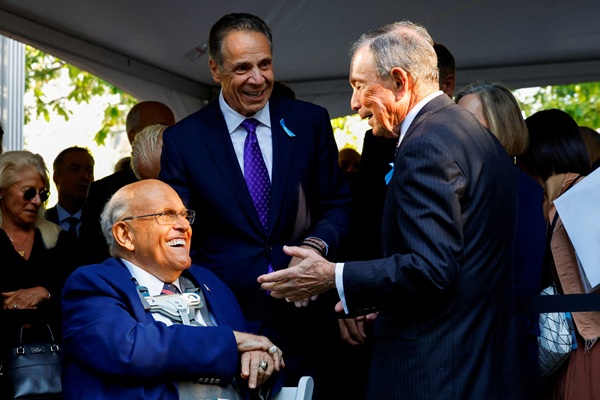 Former New York City Mayor Rudy Giuliani, New York City mayoral candidate, and former New York Governor, Andrew Cuomo and Michael Bloomberg talk on the day of a ceremony marking the 24th anniversary of the September 11, 2001 attacks on the World Trade Center at the 9/11 Memorial and Museum in the Manhattan borough of New York City, U.S., September 11, 2025. REUTERS/Kylie Cooper TPX IMAGES OF THE DAY