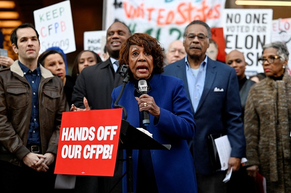 FILE PHOTO: U.S. Representative Maxine Waters (D-CA) speaks as supporters of the Consumer Financial Protection Bureau (CFPB) rally after Acting Consumer Financial Protection Bureau (CFPB) Director Russell Vought told all of the agency's staff to stay away from the office and do no work, outside the CFPB in Washington, U.S., February 10, 2025. REUTERS/Craig Hudson/File Photo