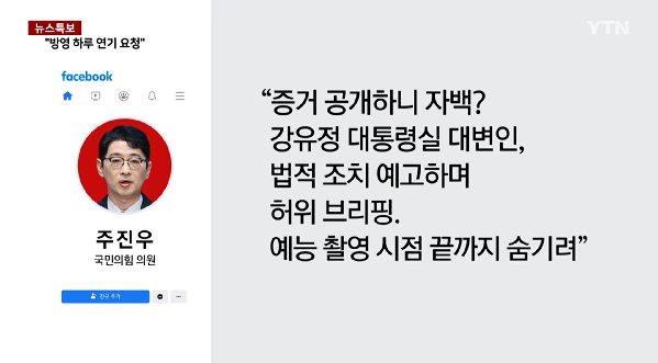 당초 5일 밤 9시에 예정됐던 방송은 6일 밤 10시로 변경됐으며, 대통령실은 국가정보자원관리원 화재로 인한 전산망 복구 담당 공무원의 사망에 따라 전 부처가 추모의 시간을 갖고 있다는 점을 감안해 JTBC에 방영 연기를 정중히 요청했다고 밝혔습니다.