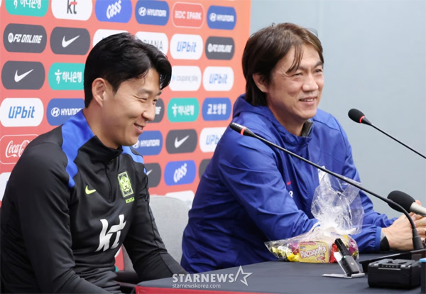 한국 축구대표팀이 9일 브라질과 A매치를 앞두고 서울월드컵경기장에서 최종 훈련에 임했다. 홍명보 감독과 손흥민이 훈련 전 기자회견에서 기자들의 질문에 답하고 있다. 홍명보 감독이 이끄는 대표팀은 10일 브라질과 친선경기에 이어 14일에는 파라과이와도 대결하며 2026 북중미 월드컵 실전 점검에 나선다. [스타뉴스]