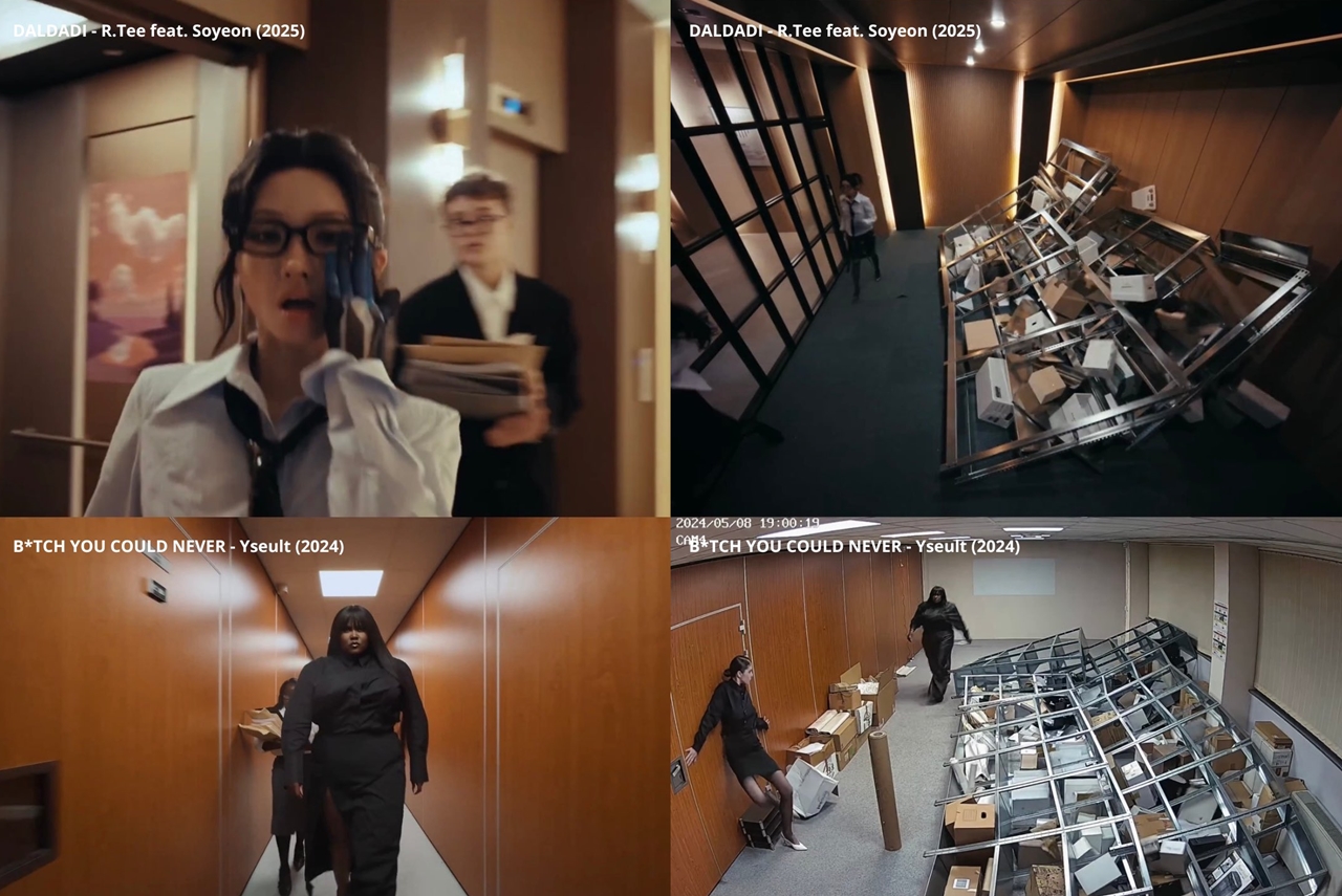 실제로 ‘담다디’ 뮤직비디오에는 여성이 복도를 걸어 나오는 장면, 거대한 책장을 넘어뜨리는 장면, 사무실에서 단체로 춤을 추는 장면 등 이졸트 뮤직비디오와 유사한 장면이 다수 등장한다.
