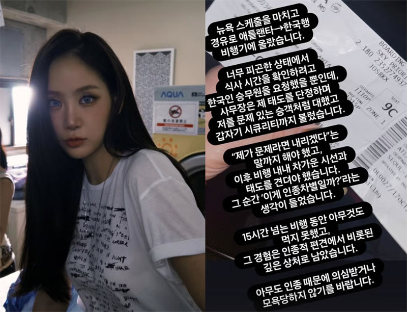 이어 “‘제가 문제라면 내리겠다’는 말까지 해야했고 이후 비행 내내 차가운 시선과 태도를 견뎌야 했다”라며 “그 순간 ‘이게 인종차별일까’라는 생각이 들었다”라고 호소했다.