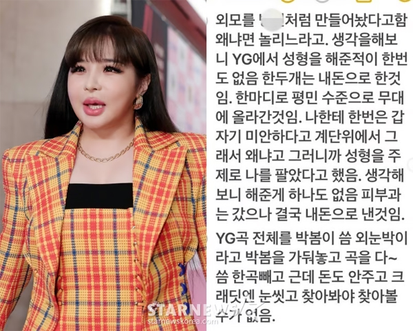 박봄은 “외모를 병X처럼 만들어놨다고 함. 왜냐면 놀리느라고. 생각을 해보니 YG에서 성형을 해준 적이 한 번도 없음. 한 두개는 내 돈으로 한 것임. 한 마디로 평민 수준으로 무대에 올라간 것임”이라고 불만을 드러냈다.