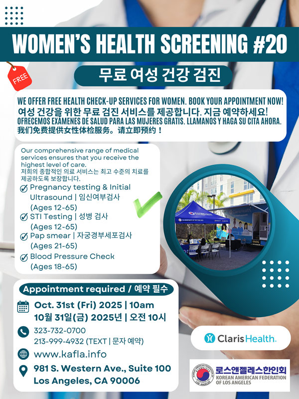 LA한인회가 31일 금요일 제20회 무료 여성건강검진을 실시합니다.