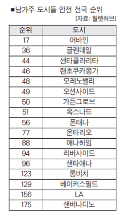 한인 선호 지역인 오렌지카운티 어바인의 경우 전국 17위로 남가주 도시들 중 최상위였고, 캘리포니아 전체로 봐서도 두 번째로 순위가 높았다. 이어 주요 남가주 도시들의 전국 순위를 보면 글렌데일 36위, 샌타클라리타 44위로 비교적 안전한 도시로 꼽혔고, 이어 랜초쿠카몽가 46위, 모레노밸리 48위, 가든그로브 50위 등이었다.