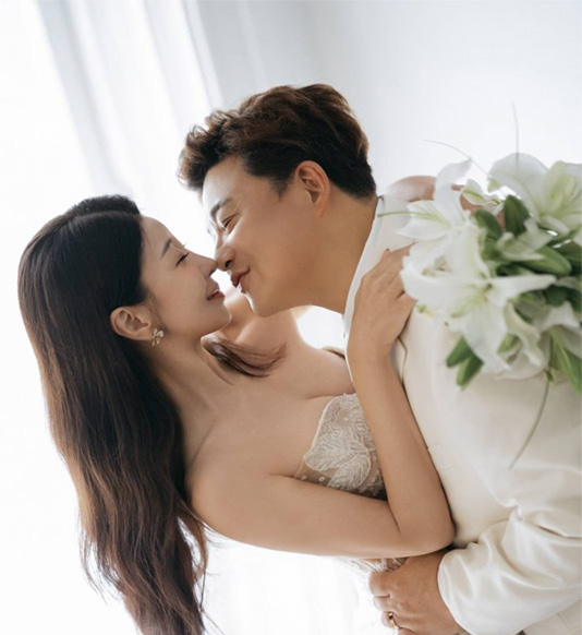 또 다른 사진 역시 두 사람의 ‘밀착’ 비주얼을 담았다. 윤정수와 원진서는 투명한 우산 아래에서 다정하게 마주 선 채 지그시 눈을 감고 행복한 미소를 짓고 있다. 원진서는 우아한 자태와 청순한 미모로 시선을 사로잡았고, 윤정수는 왼손 약지에 결혼반지를 낀 채 설렘 가득한 새신랑의 면모를 드러냈다.
