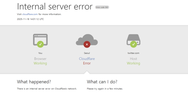 글로벌 웹 인프라 기업인 **클라우드플레어(Cloudflare)**가 플랫폼 장애를 일으키면서 오픈AI의 생성형 인공지능(AI) 서비스인 챗GPT(ChatGPT) , X등을 포함한 주요 웹사이트에서 접속 장애가 발생하고 있습니다.