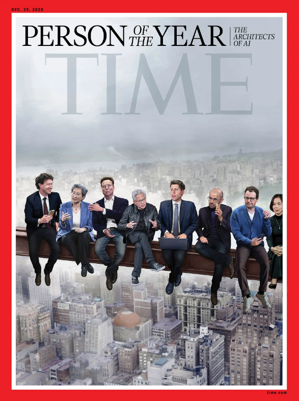 타임지가 공개한 커버 이미지는 1932년 촬영된 전설적 사진 ‘마천루 위에서의 점심’을 재해석한 일러스트로, 당시 철골 위 건설 노동자 대신 AI 산업을 대표하는 주요 인물들이 자리했습니다.