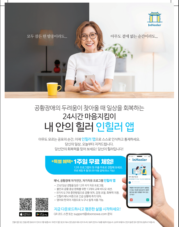 주의: InHealer 앱은 자가 관리 도구로, 심각한 정신건강 위기 상황에서는 즉시 전문가의 도움을 받아야 합니다. 911 또는 가까운 응급실에 연락하시거나, 자살 예방 핫라인(988)을 이용하십시오.
