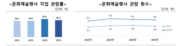 ‘문화예술행사 직접 관람 횟수’는 2.4회로, 작년 대비 0.2회 감소했다. 다만, 스마트 기기 등 다양화된 매체를 활용한 ‘문화예술행사 간접 관람률’은 72.0%로, 작년 대비 0.4%포인트 상승했다.