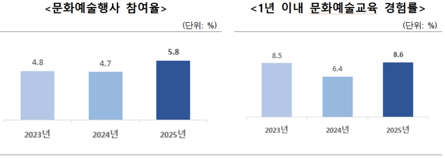문화예술 관련 발표회·전시회 및 창작활동에 참여한 ‘문화예술 행사 참여율’은 5.8%로, 작년 대비 1.1%포인트, ‘문화예술교육 경험률’은 8.6%로, 작년 대비 2.2%포인트 각각 상승하는 등 단순 관람 활동은 감소하고, 문화예술 행사에 직접 참여하는 주체적인 활동이 다소 증가한 것으로 나타났다.