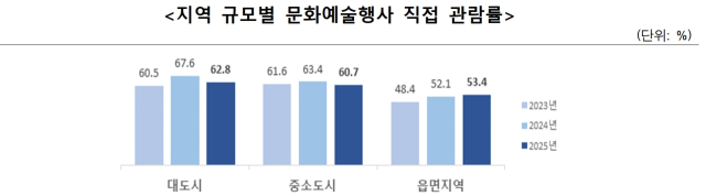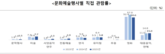먼저 2025년 국민문화예술활동조사 결과에 따르면 문화누림의 대표적인 지표인 ‘문화예술행사 직접 관람률’은 60.2%로, 작년 대비 2.8%포인트 감소했다. 분야별 관람률은 영화(50.6%), 대중음악 및 연예(15%), 미술(7.7%), 뮤지컬(5.8%) 순으로 나타났다. 직접 관람률 감소는 영화 분야가 무려 6.4%포인트 감소한 데 영향을 받았다. 반면 대중음악 및 연예는 0.4%포인트, 미술은 2.1%포인트 상승했다.