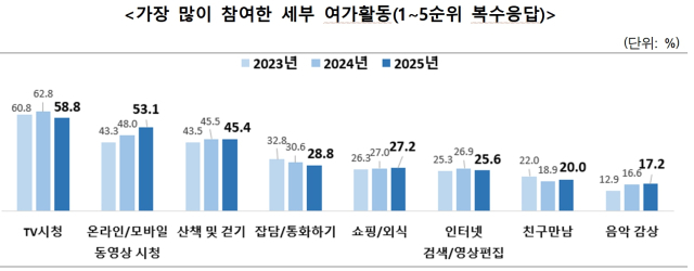 2025년 국민여가활동조사 결과에 따르면 우리나라 국민이 ‘한 번 이상 참여한 여가활동’ 1인당 평균 개수는 15.7개로, 작년(16.4개) 대비 감소했다. 역시 스마트기기 등 매체 때문으로 해석된다.