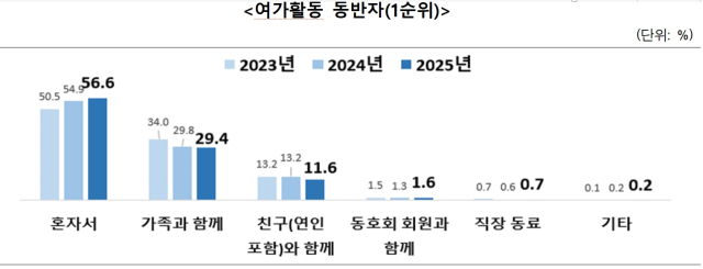 ‘여가활동의 동반자’는 혼자(56.6%), 가족과 함께(29.4%), 친구·연인(11.6%), 동호회 회원(1.6%), 직장 동료(0.7%) 순으로 나타났으나, 혼자 하거나 동호회 회원, 직장 동료와 함께하는 비율은 증가, 친구·연인 및 가족과 함께하는 비율은 감소해 사회적 관계 속 여가 동반자에 대한 선호가 증가했다. 여가활동의 목적은 개인의 즐거움(39.8%), 마음의 안정과 휴식(23.5%), 건강(13.2%) 등의 순으로 나타났다.