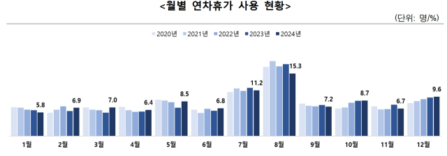 연차 사용의 월별 현황을 살펴보면 8월 사용률이 15.3%로 가장 높아 하계 휴가 기간에 집중되는 것은 여전하나 2월~6월, 10월, 12월 등의 사용률이 전년 대비 증가해 휴가 사용이 분산되는 현상을 보여주고 있다.