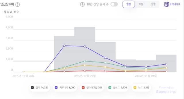 3일 서울경제신문이 ‘썸트렌드’를 통해 지난달 26일부터 1월 2일까지 일주일 간 커뮤니티·인스타그램·엑스·블로그 상의 이 후보자의 언급량을 조사한 결과, 총 1만4322건의 수치를 기록했다. 지난해 같은 기간 대비 언급량이 무려 7만9467% 증가했다. 이 후보자 언급량은 지난달 27일 3건에 불과했지만, 이튿날 기획예산처 장관 후보자로 지명되지 3365건으로 치솟았다가 29일에는 4257건으로 정점을 찍었다.