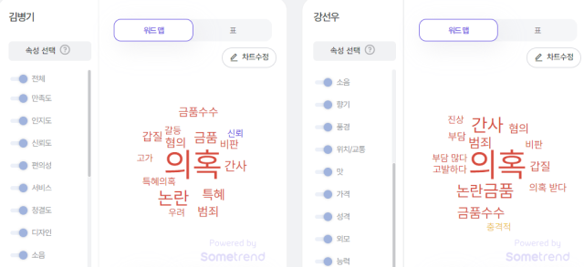 두 의원에 대한 온라인 민심도 뜨겁게 달아올랐다. 김 의원의 한 주간 언급량은 1만2445건으로 지난해 같은 기간 대비 6776% 급증했고, 강 의원은 2337% 오른 5263건으로 집계됐다. 단연 연관어 역시 매우 부정적인 내용들도 채워졌다. 김 의원과 강 의원의 부정 연관어 비중은 각각 86%, 85%를 나타냈다. 공통적으로 금품수수, 범죄, 갑질, 의혹 등이 함께 검색됐다. 경찰이 두 의원의 각종 의혹에 대한 수사에 착수하면서 진행 상황에 따라 파장이 더 크질 여지도 있다.