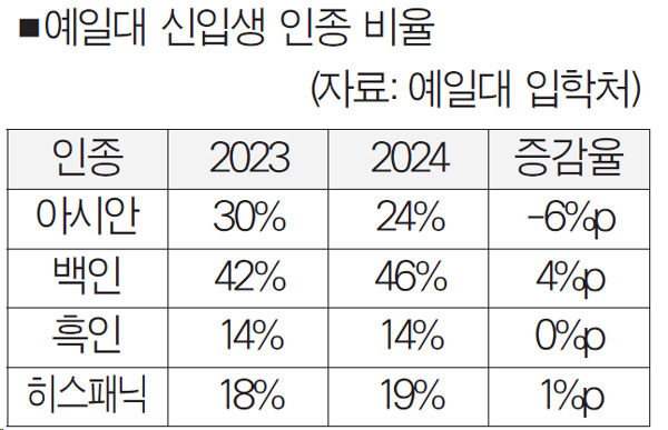 예일대가 4일 발표한 2024~2025 학년도 신입생 인종별 통계에 따르면 백인 신입생 비율은 46%로 전년의 42%에 비해 4%포인트 상승했다. 예일대 신입생 중 백인비율은 2021~2022학년도에 50%를 기록한 이후 3년 연속 감소했으나 올해 크게 반등한 것이다.