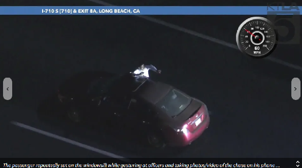 추격 중 동승자는 수차례 조수석 창문 턱에 앉아 경찰을 향해 손짓을 하거나 휴대폰으로 추격 장면을 촬영하는 듯한 행동을 보였습니다.