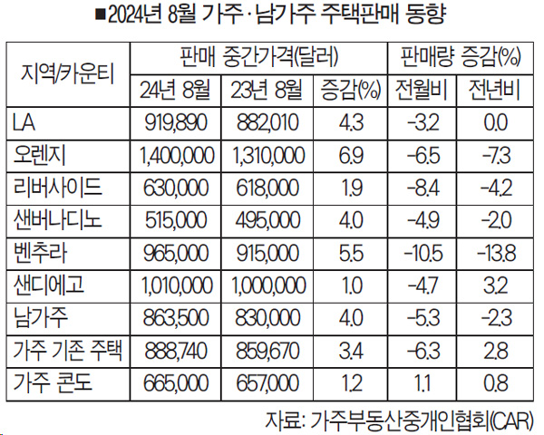 남가주를 비롯, 캘리포니아주 단독주택 중간가가 지난 8월에도 고공 상승세를 이어갔다. 반면 매물 부족 등으로 판매량은 일제히 감소세로 돌아섰다.