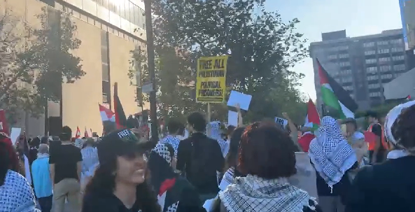 로스앤젤레스 퍼싱 스퀘어에서는 토요일 오후 2시경부터 시위대가 모여 인근 거리를 행진했습니다. 참가자들은 깃발과 배너, 표지판을 들고 팔레스타인을 지지하는 목소리를 냈습니다.