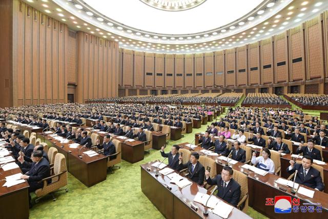 북한은 지난 7~8일 평양 만수대의사당에서 최고인민회의 제14기 제11차 회의를 열어 사회주의헌법 일부 내용을 수정보충(개정)했다고 조선중앙통신이 9일 보도했다. 평양=조선중앙통신 연합뉴스