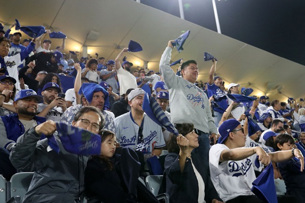 Oct 13, 2024; Los Angeles, California, USA; Los Angeles Dodgers fans react in the eighth inning during game one of the NLCS for the 2024 MLB Playoffs at Dodger Stadium. Mandatory Credit: Kiyoshi Mio-Imagn Images