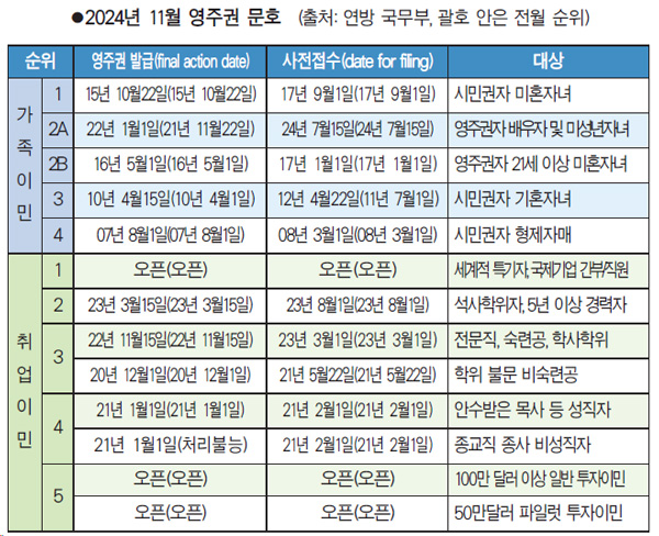 영주권 사전접수 허용 우선일자도 2순위와 3순위, 4순위는 10월 문호 일자에서 그대로 동결됐다. 그러나 세계적 특기자와 기업간부 등을 대상으로 하는 1순위와 투자이민인 5순위는 11월에도 영주권 판정일과 사전접수 허용일 모두 오픈되면서 순항을 이어갔다.