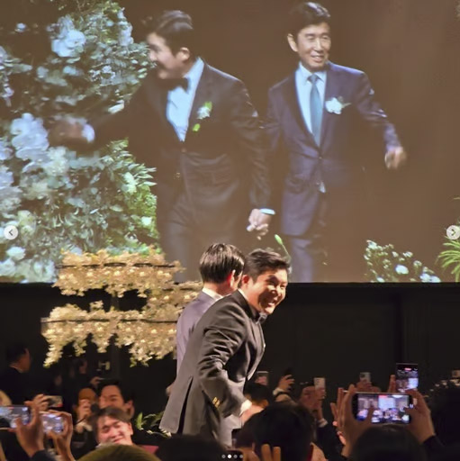 지인의 SNS를 통해 포착된 새신랑 조세호는 입이 귀에 걸린 모습. 그는 결혼식에 참석해준 소중한 하객들에게 잘 살겠다고 말하며 감사를 전했다.