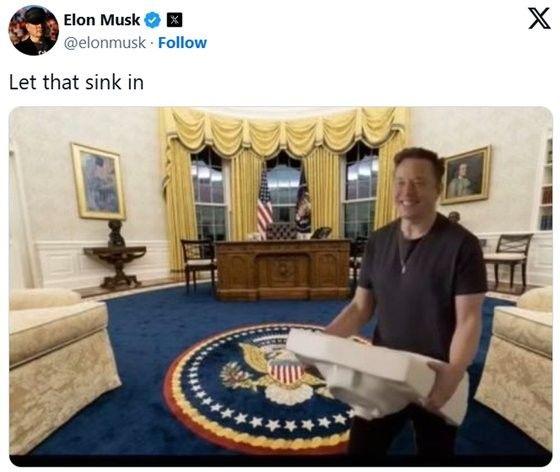 트럼프 전 대통령을 공개 지지해 온 머스크는 대선 당일인 6일(현지시간) 미 백악관 집무실을 배경으로 자신이 싱크대(세면대)를 든 사진을 합성해 올렸다. 그러면서 “싱크대를 안으로 들여보내 줘(Let that sink in)”란 글을 함께 남겼다. ‘싱크인'(sink in)은 ‘충분히 이해되다’ ‘인식되다’ ‘스며들다’라는 의미로 사용되는 관용적 표현이다. ‘싱크(sink)’라는 단어가 가진 복수의 의미를 사용한 유머라 볼 수 있다.