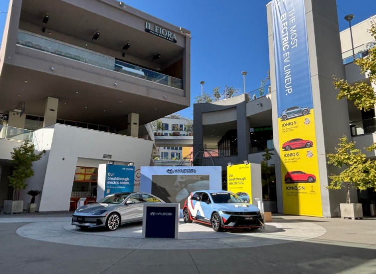 현대 자동차 미국 판매 법인이 현대자동차의 최신 전기차 모델인 아이오닉 모델을 부에나 팍에 위치한 OC 소스몰에 전시하고 있습니다
