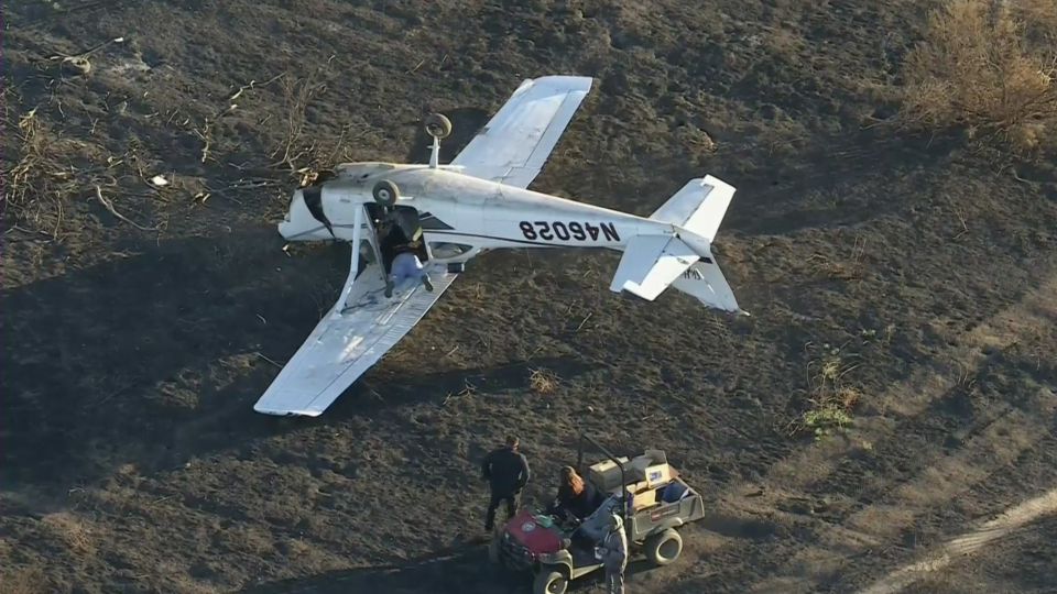 오늘 (14 일 ) 아침 밴 나이스 지역 405 번 프리웨이 근처 들판에 소형 비행기가 추락해 전복됐지만 탑승자 두 명은 생존했습니다.