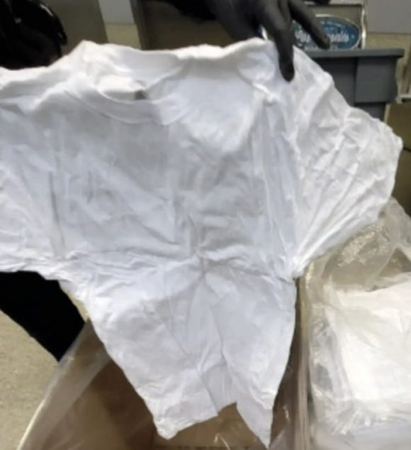 LA 국제공항 세관 당국은 수하물 내부를 들여다보는 엑스레이(X-ray) 검사를 통해 A씨의 여행가방에서 수상한 점을 발견하고 수색에 나섰다. 그 결과 여행가방 안감에 숨겨져 있던, 액체 상태의 마약이 묻었다가 굳은 12장 이상의 티셔츠를 발견했다. 해당 마약은 필로폰으로 잘 알려진 ‘메타암페타민’이다. 티셔츠들의 무게 합계는 30파운드(약 13㎏)에 달했다.