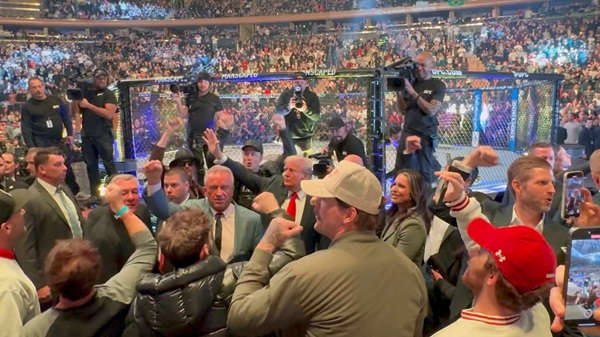 트럼프 당선인은 ‘퍼스트 버디'(대통령의 절친)라는 별명이 붙은 일론 머스크 테슬라 CEO 등 측근들과 함께 데이나 화이트 UFC 최고경영자(CEO)의 안내를 받으면서 옥타곤 경기장 앞에 마련된 VIP 좌석으로 이동했다.