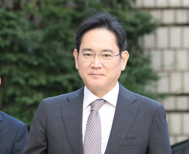 이재용 삼성전자 회장이 11일 오후 서울 서초구 서울고등법원에서 열린 삼성 부당 합병 혐의 관련 2심 속행 공판에 출석하고 있다. 연합뉴스