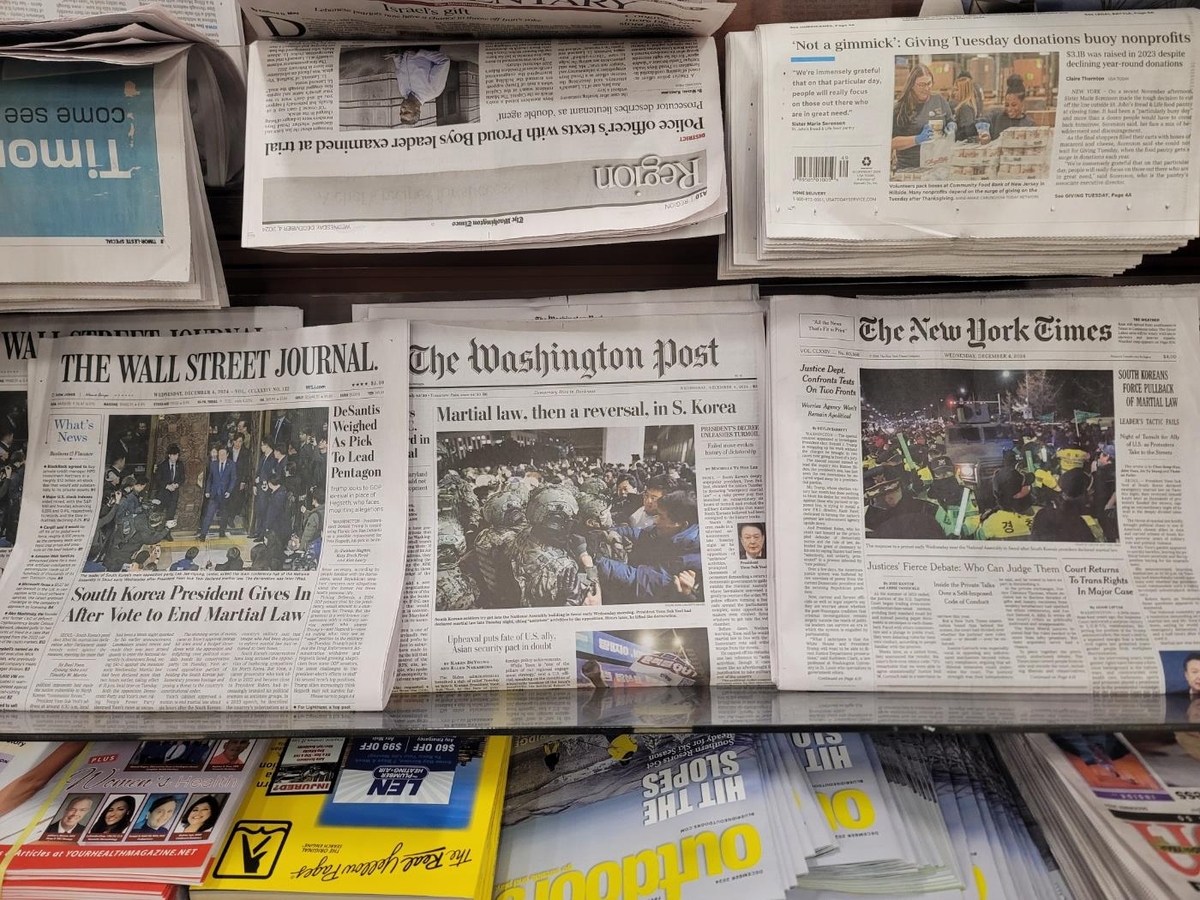 4일(현지시간) 미국 버지니아주의 한 마트 신문 가판대에 이날자 1면 머릿기사와 사진으로 한국 계엄 사태를 다룬 월스트리트저널(WSJ·왼쪽부터), 워싱턴포스트(WP), 뉴욕타임스(NYT) 등이 진열돼 있다. 2024.12.5. jhcho@yna.co.kr