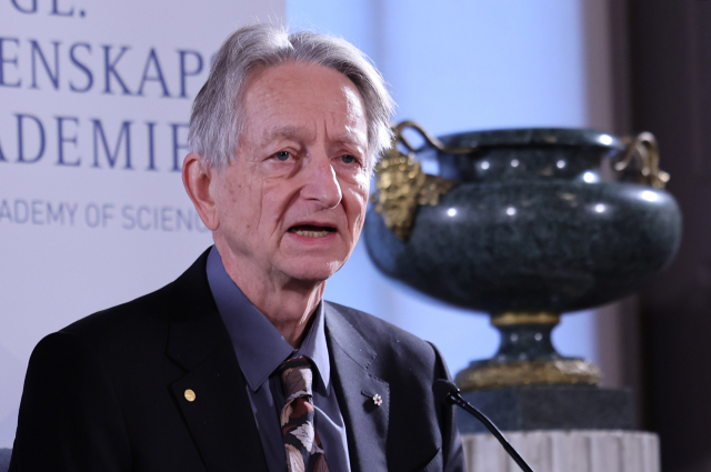 노벨 물리학상 수상자인 제프리 힌턴 캐나다 토론토대 명예교수가 7일(현지시간) 스톡홀름 스웨덴 왕립과학원에서 열린 노벨 물리·화학·경제학상 수상자 기자회견에서 취재진 질문에 답하고 있다. 뉴스1