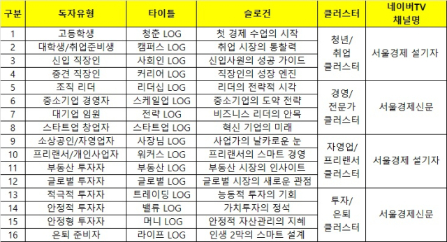 지난 2일 부터 독자를 고등학생, 대학생·취업준비생, 신입 직장인, 소상공인, 투자자 등 16개 유형으로 분류해 각 유형별로 6개 기사를 선별한 후 기사 제목과 핵심 요약, 인사이트를 제시하는 숏폼을 제작해 네이버TV에 업로드하고 있다.