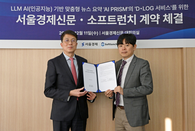 손동영 서울경제신문·서울경제TV 대표와 배진흥 소프트런치 대표는 11일 서울 종로구 서울경제 대회의실에서 ‘생성형 AI 기반 맞춤형 뉴스 요약 AI 프리즘의 디로그 서비스를 위한 계약’을 맺었다.