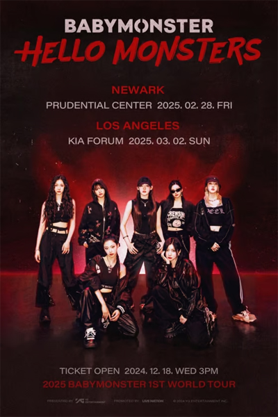 YG엔터테인먼트는 12일(한국시간) 공식 블로그에 ‘2025 BABYMONSTER 1st WORLD TOUR IN NORTH AMERICA’를 게재했다. 이에 따르면 베이비몬스터는 오는 2월 28일 미국 뉴저지 뉴아크, 3월 2일 로스엔젤레스에서 각각 1회씩 공연을 개최한다.