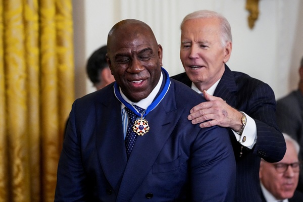 퇴임을 앞둔 조 바이든 미국 대통령이 4일(현지시간) 민주당 대선 후보였던 힐러리 클린턴 전 국무장관과 왕년의 농구스타 매직 존슨 등 19명에게 ‘대통령 자유의 메달'(Presidential Medal of Freedom)을 수여했다.