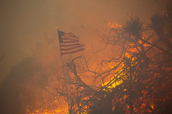 A U.S. flag flutters amidst smoke and fire as the Palisades fire burns during a weather-driven windstorm on the west side of Los Angeles, California, U.S. January 7, 2025. REUTERS/Ringo Chiu