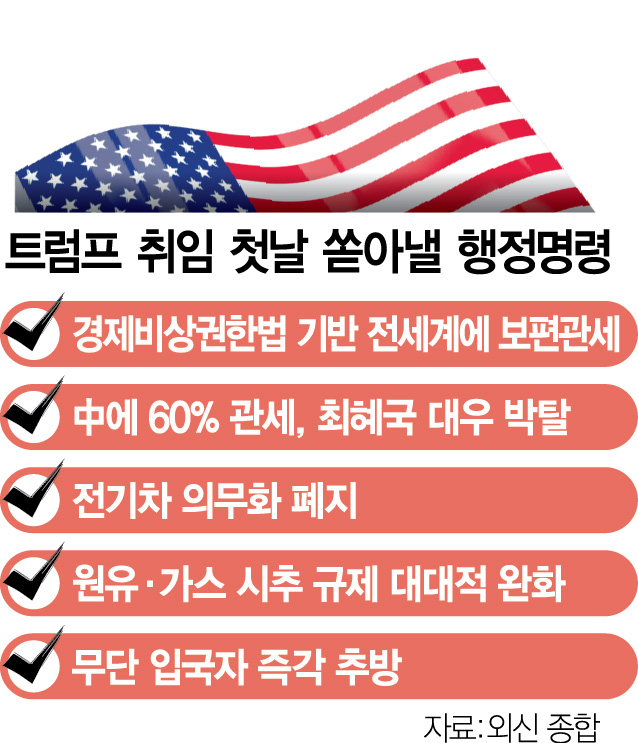 특히 1977년 제정된 국제경제비상권한법(IEEPA)을 근거로 경제 비상사태를 선포해 전 국가를 상대로 보편관세를 도입하는 방안이 유력하게 검토되고 있다. 한 외교 소식통은 “보편·상호관세를 도입하고 중국과는 무역 전쟁을 벌이는 동시에 해외 첨단 기업들의 미국 내 공장 설립을 강하게 압박할 것”이라고 전망했다.